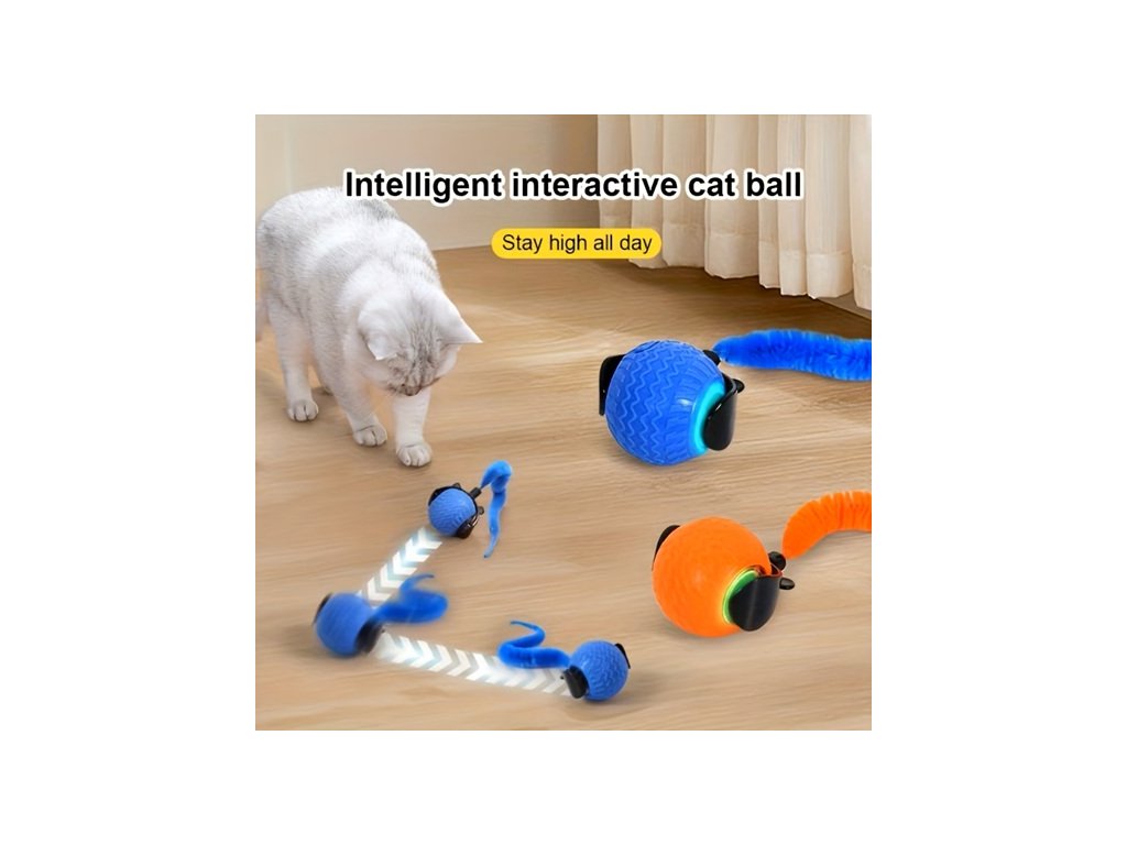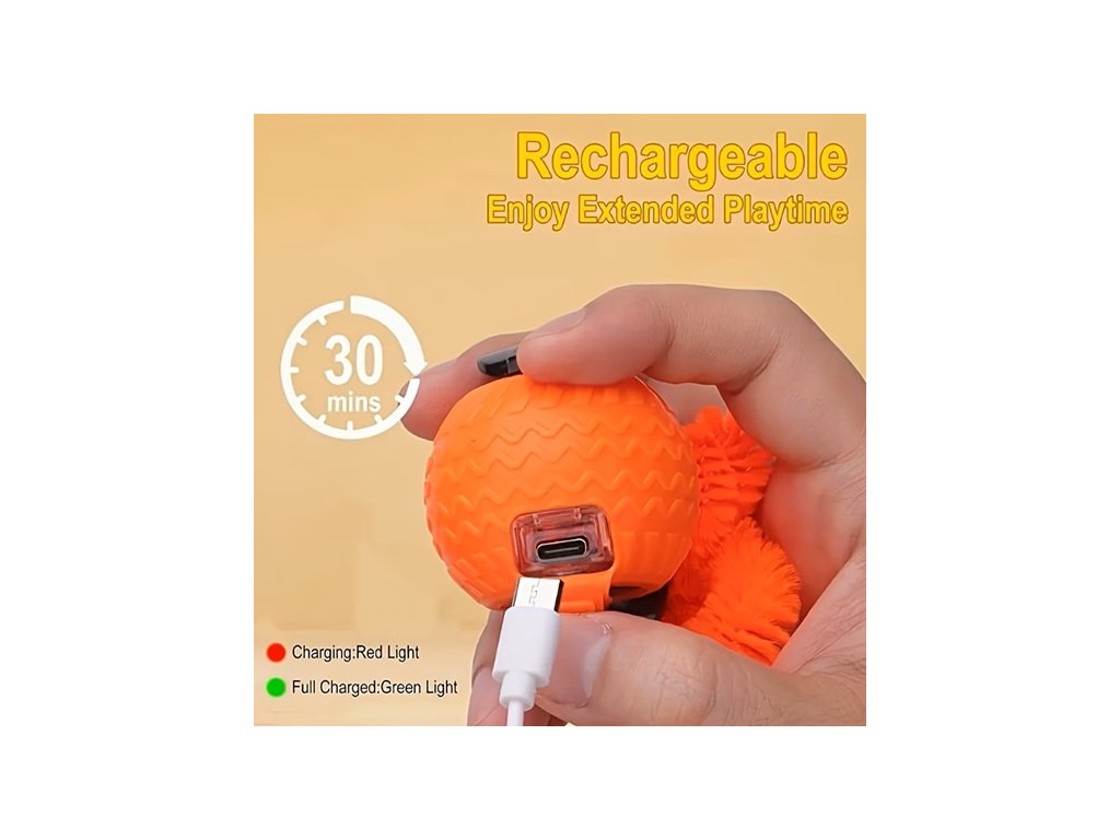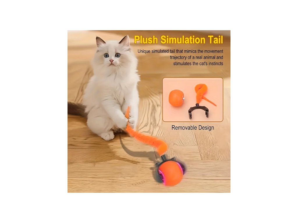 Interaktivní hračka pro kočky a psy do interiéru - USB dobíjecí automatický rychlý míček. Pohyblivý míček s ocáskem na konci, který mění směr a probouzí tak ve zvířeti jeho instinkty hračku chytit a ulovit. Hračka je vhodná pro všechna plemena. Odolný plastový design. USB dobíjecí.