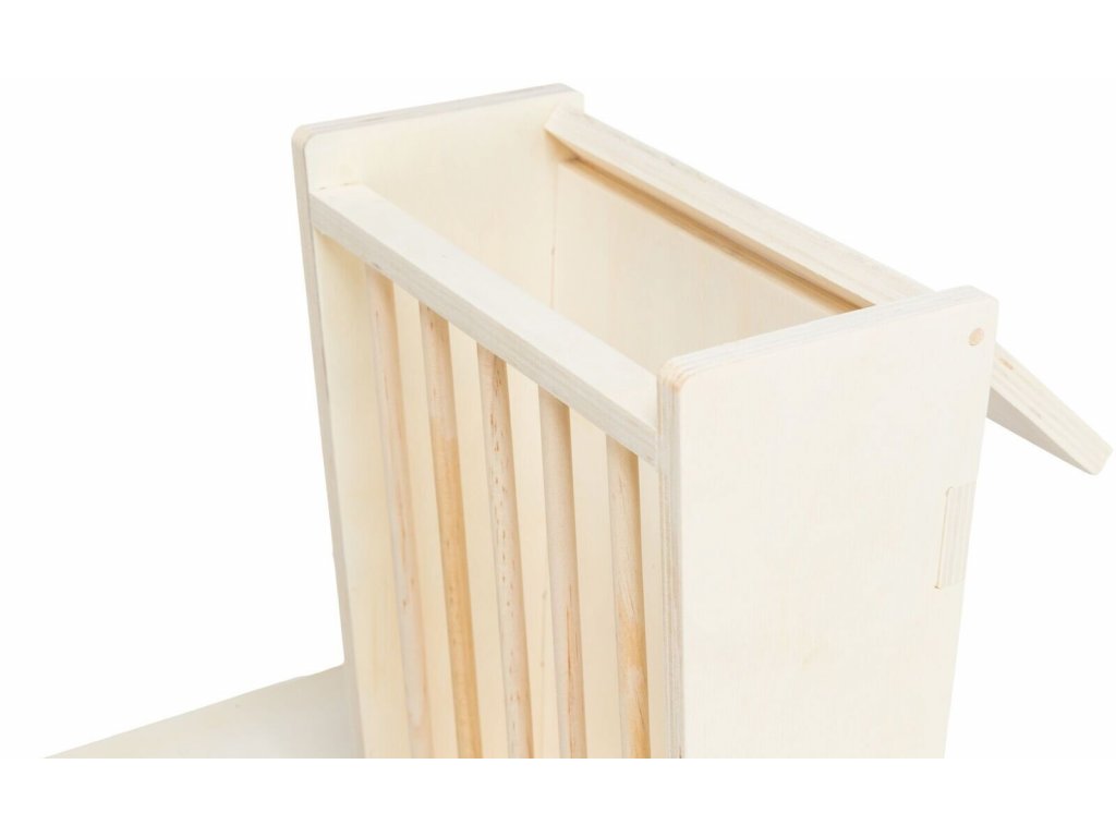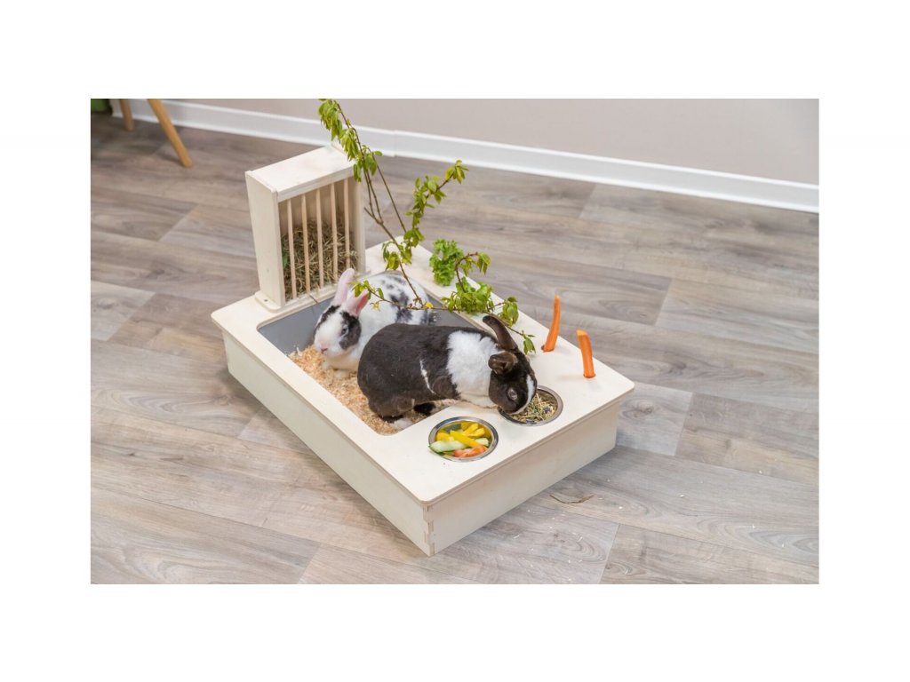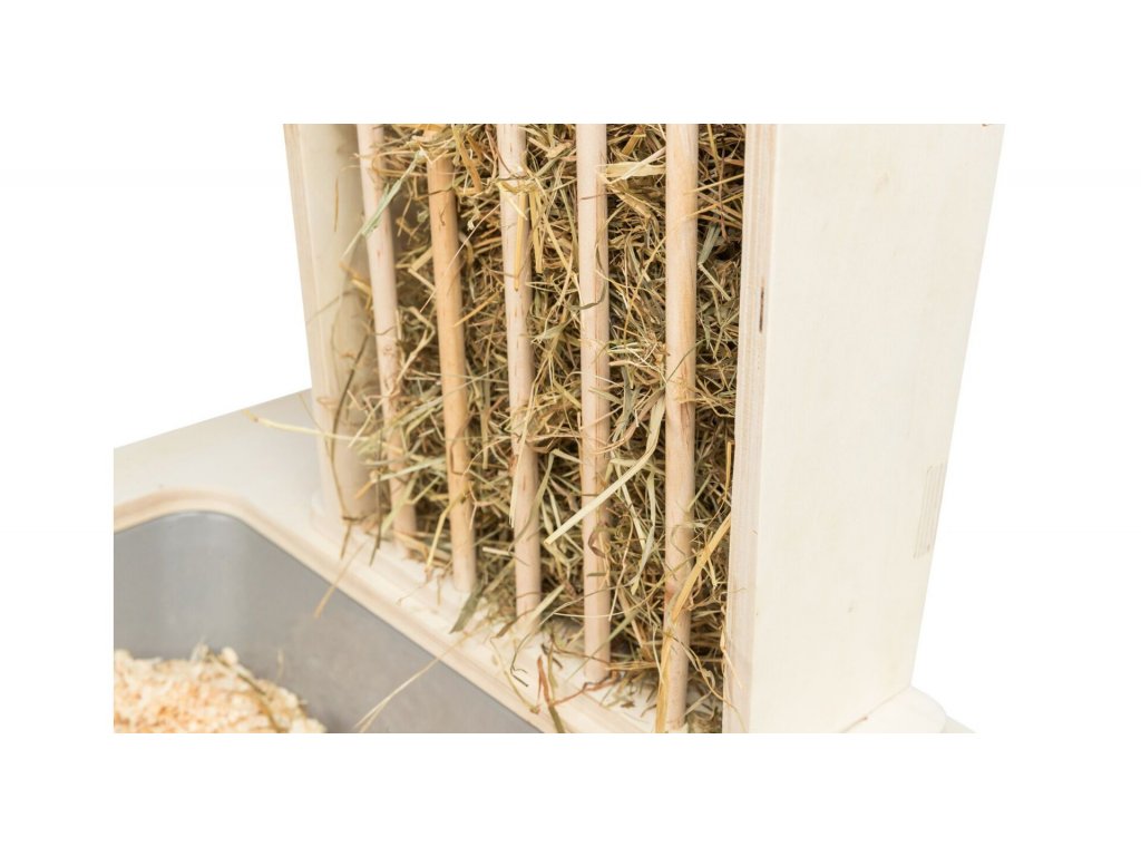 - krmný bar se 2 nerezovými miskami a jesličkami na seno