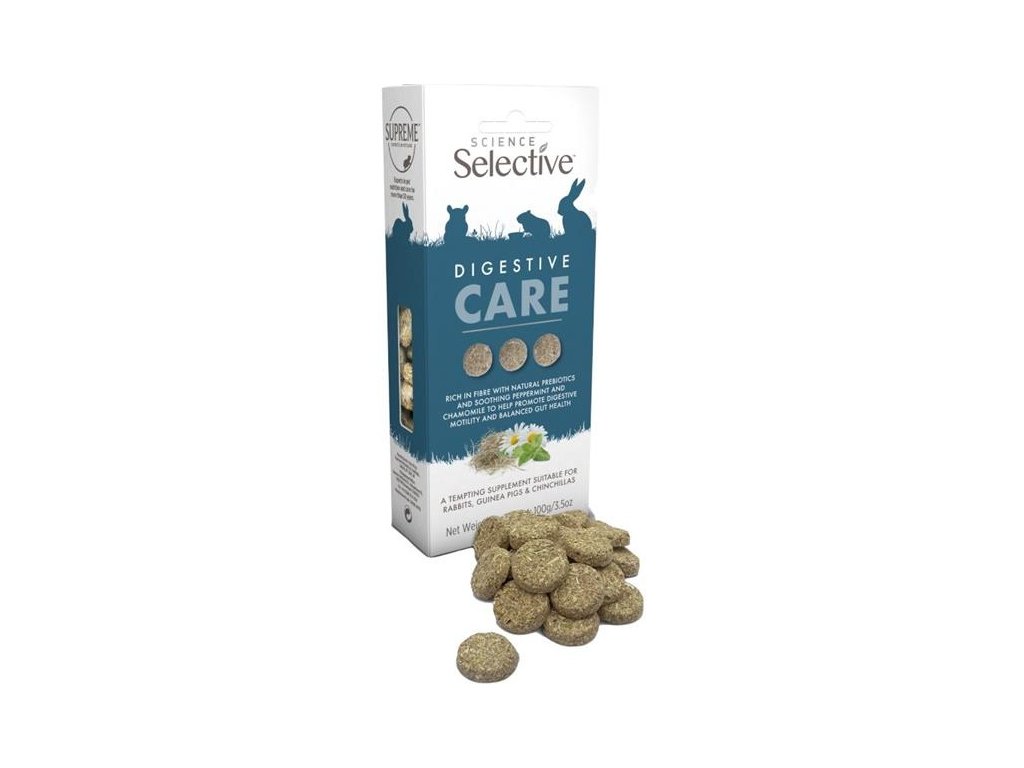Chutné pamlsky Science Selective Digestive Care jsou bohaté na vlákninu, obsahují přírodní prebiotika a zklidňující mátu peprnou a heřmánek. Podporují zdraví střev a celkovou rovnováhu trávicí soustavy králíků, morčat a činčil se sklony k plynatosti, nadýmání a tvorbě chomáčů chlupů (trichobezoárů) v žaludku. Pamlsky jsou ideální pro krmení z ruky – k navázání či prohloubení vztahu s drobným mazlíčkem. Složení je čistě přírodní, bez umělých barviv, příchutí a přidaných cukrů.