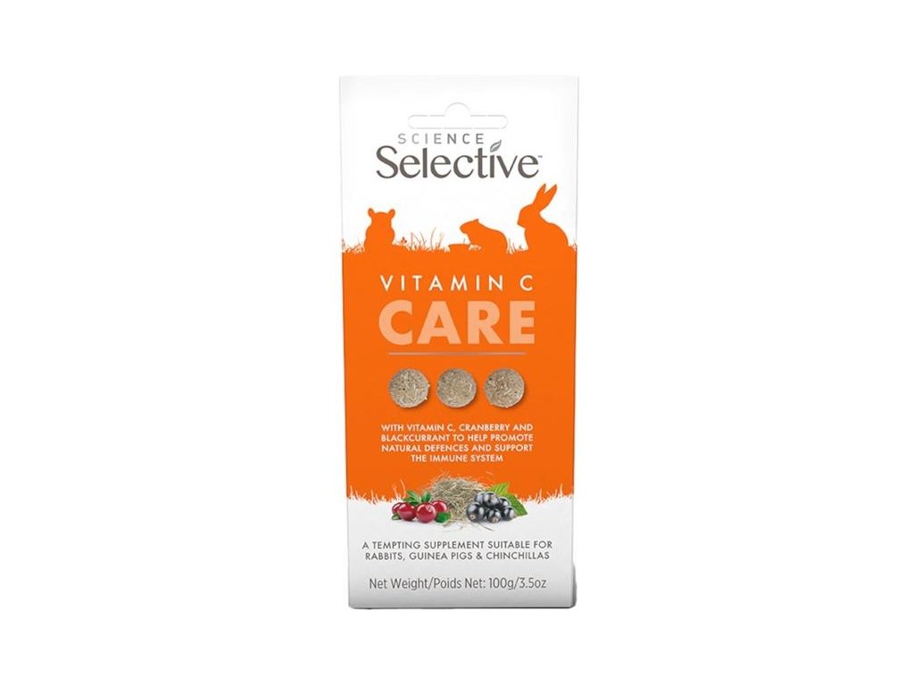 Chutné pamlsky Science Selective Vitamin C Care obsahují lněné semínko, brusinky, černý rybíz a vysoké množství vitamínu C. Pomáhají podporovat imunitu u králíků, morčat a činčil, kteří trpí nedostatkem vitamínu C (kurdějemi), mají oslabenou obranyschopnost, respirační obtíže nebo problémy s močovým ústrojím. Pamlsky jsou ideální pro krmení z ruky – k navázání či prohloubení vztahu s drobným mazlíčkem. Složení je čistě přírodní, bez umělých barviv, příchutí a přidaných cukrů.