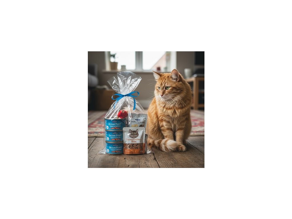 Obsah balení: 3ks - masová rybí konzerva 70g, 2ks - masová kuřecí kapsička 100g, 1ks - funkční masové pamlsky pro kočky 100g, ks - malá hračka