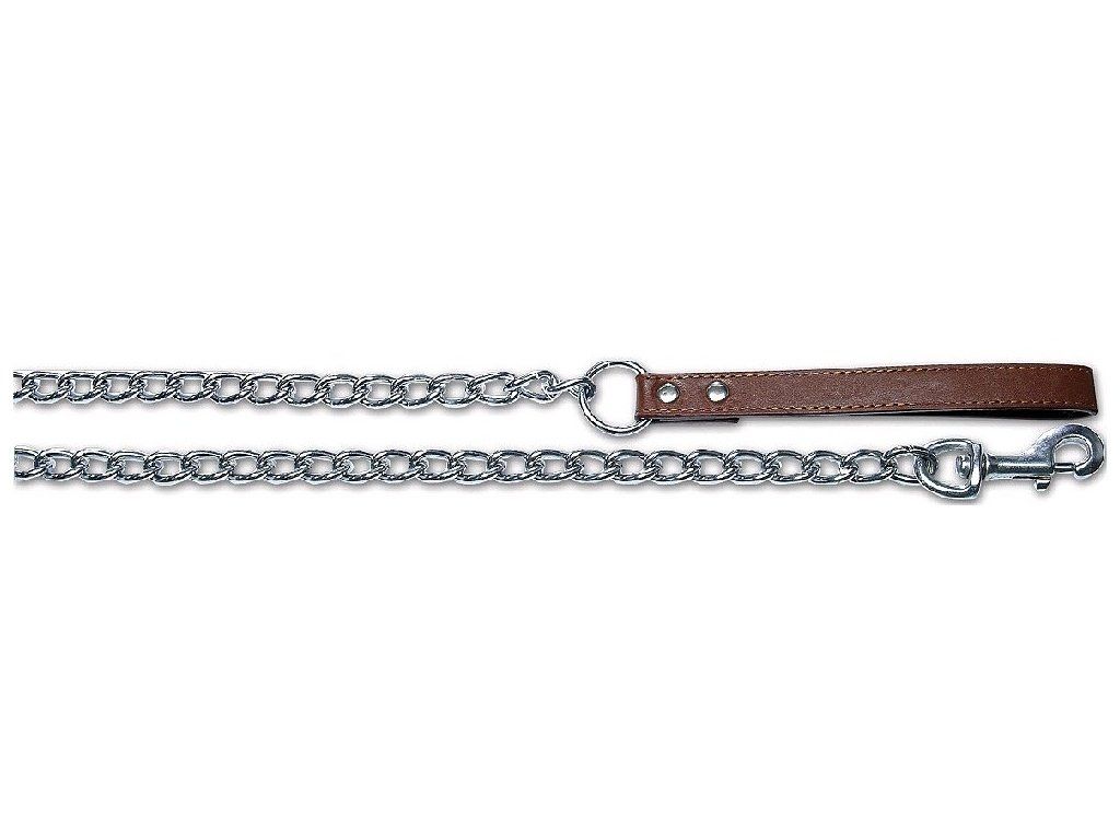 Řetízkové vodítko vhodné pro velká a maxi psí plemena. Povrchová úprava jej chrání před korozí. Kožená rukojeť dobře padne do ruky.