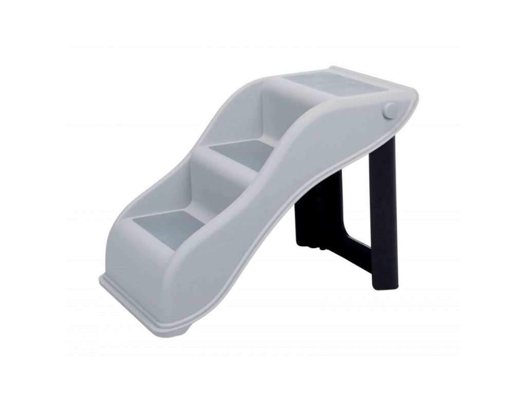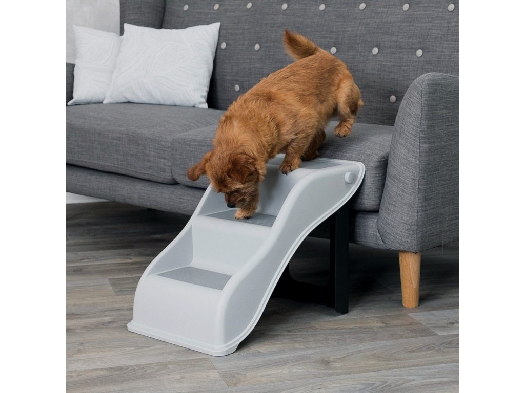 Protiskluzové schody. Vyrobeno z plastu s povrchovou úpravou TPR. Protiskluzové vložky na schůdcích, k použití uvnitř i venku, např. jako pomůcka pro lezení na postel, pohovku nebo jako pomůcka pro vstup do auta. Protiskluzové gumové nohy. Šetrné ke kloubům. Doporučeno při onemocnění zad, kloubů nebo pro starší domácí mazlíčky, vhodné i jako prevence předcházení potíží u mladých zvířat.